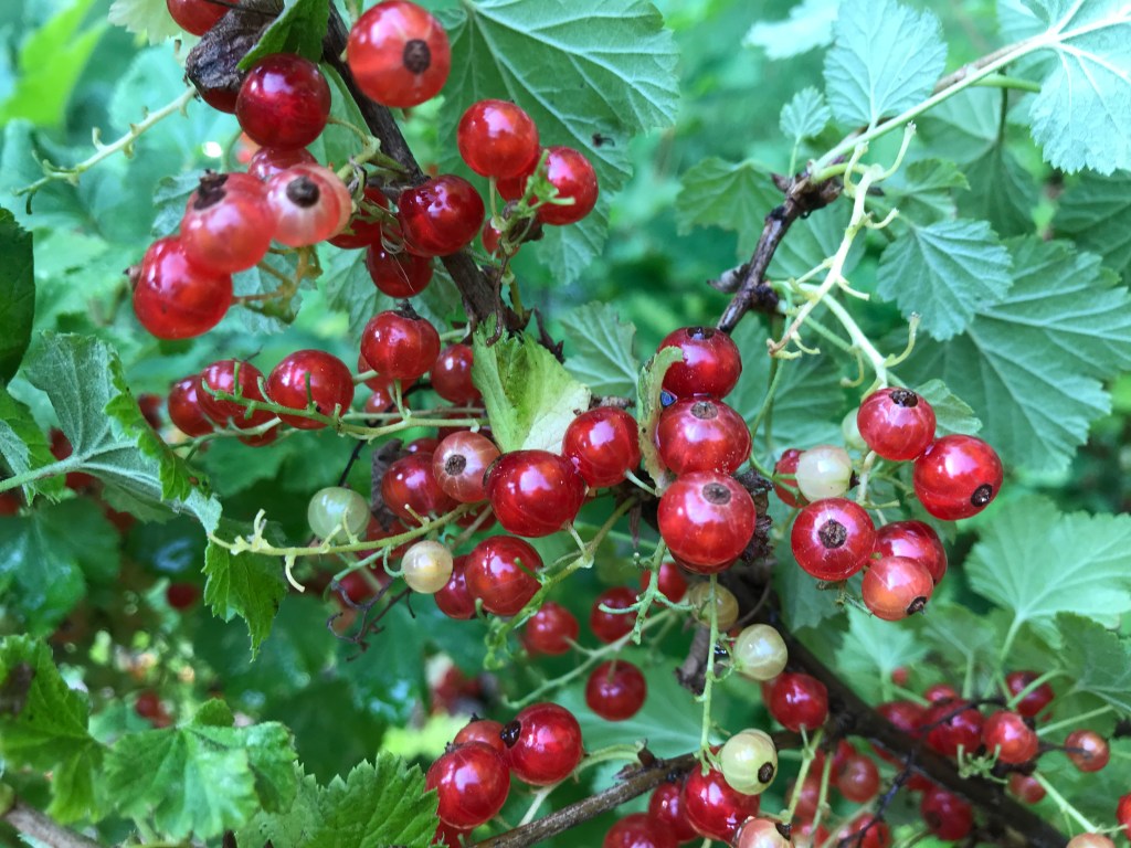 1. Well I remember planting three red currant bushes. They grew so well & so easily. One day Rosemary Schaeffer came over to pick some and after an hour we got tired, but had not even done half the bush. That tells you a lot about red currant bushes.