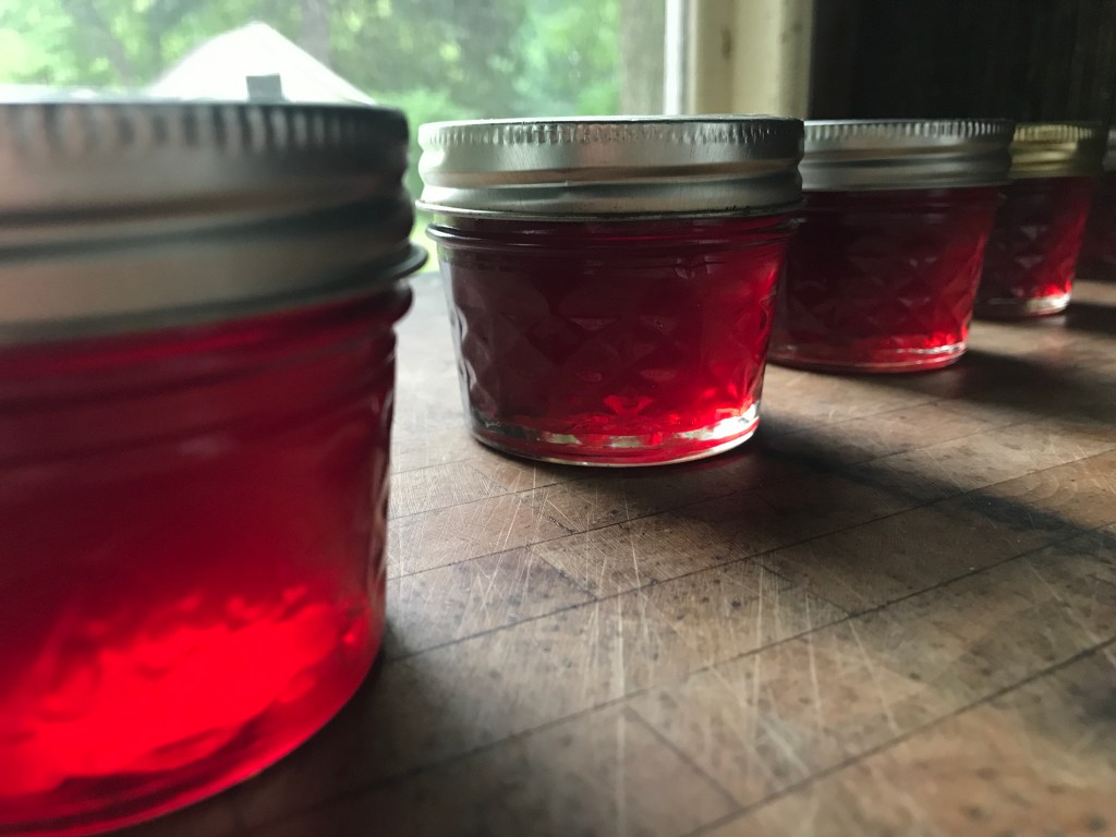 Though I already mentioned my fruit losses yesterday, the one thing that was not a loss this year was the currants. You may have noticed I’ve already written a post about them. I picked three pounds off of just two plants, which gave me three cups of juice to work with. To make currant juice, you want to simmer them with a cup of water for about thirty minutes, pressing gently on the berries to make them pop. Then strain them overnight, and you’ll be left with a garnet liquid to work with.