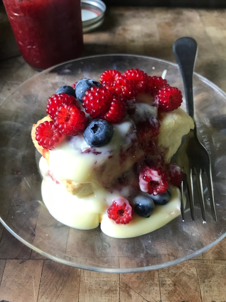 On Saturday, it rained all day, but the sun peeked out at around 6 o’clock, so we dashed to a favorite spot and picked a good amount. I served some fresh with pastry cream and biscuits for dessert on Sunday night. I also added strawberry sauce and fresh blueberries. I think I might make a syrup out of the rest of them. Wineberries have large seeds, so they don’t make the best jam, in my opinion, unless they are mixed with something. They go very well with blueberries.