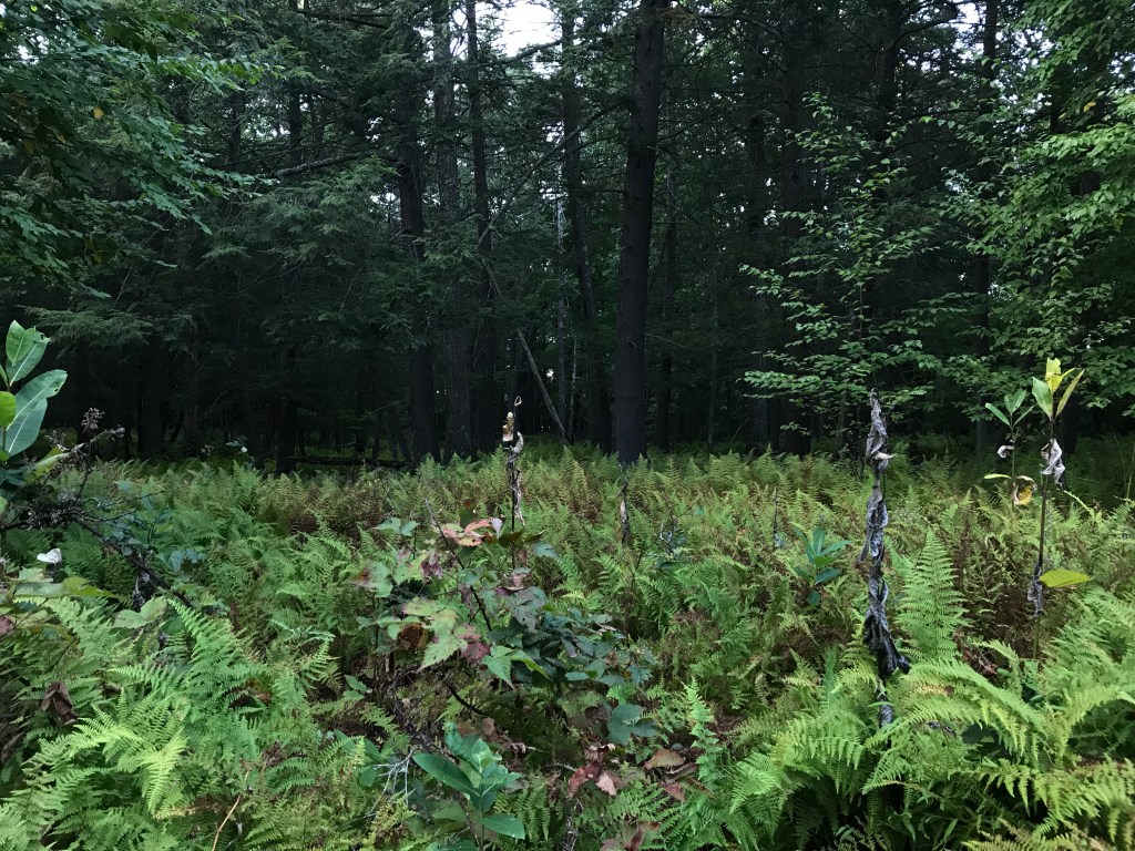 Even though it’s been hot and humid this week, fall still moves in swiftly. Mornings and evenings are cool. The black birch leaves line the hard brown trail and fall into the creek. The lemon yellow leaves float into the cold water heading towards the narrow channels of rocks, where they gather and slow the water. The ferns are low to the ground, turning brown and yellow. You can see their stems now, and the dark ground below feeding off the decay. I love this aspect of the fall–how space is revealed as matter decomposes.