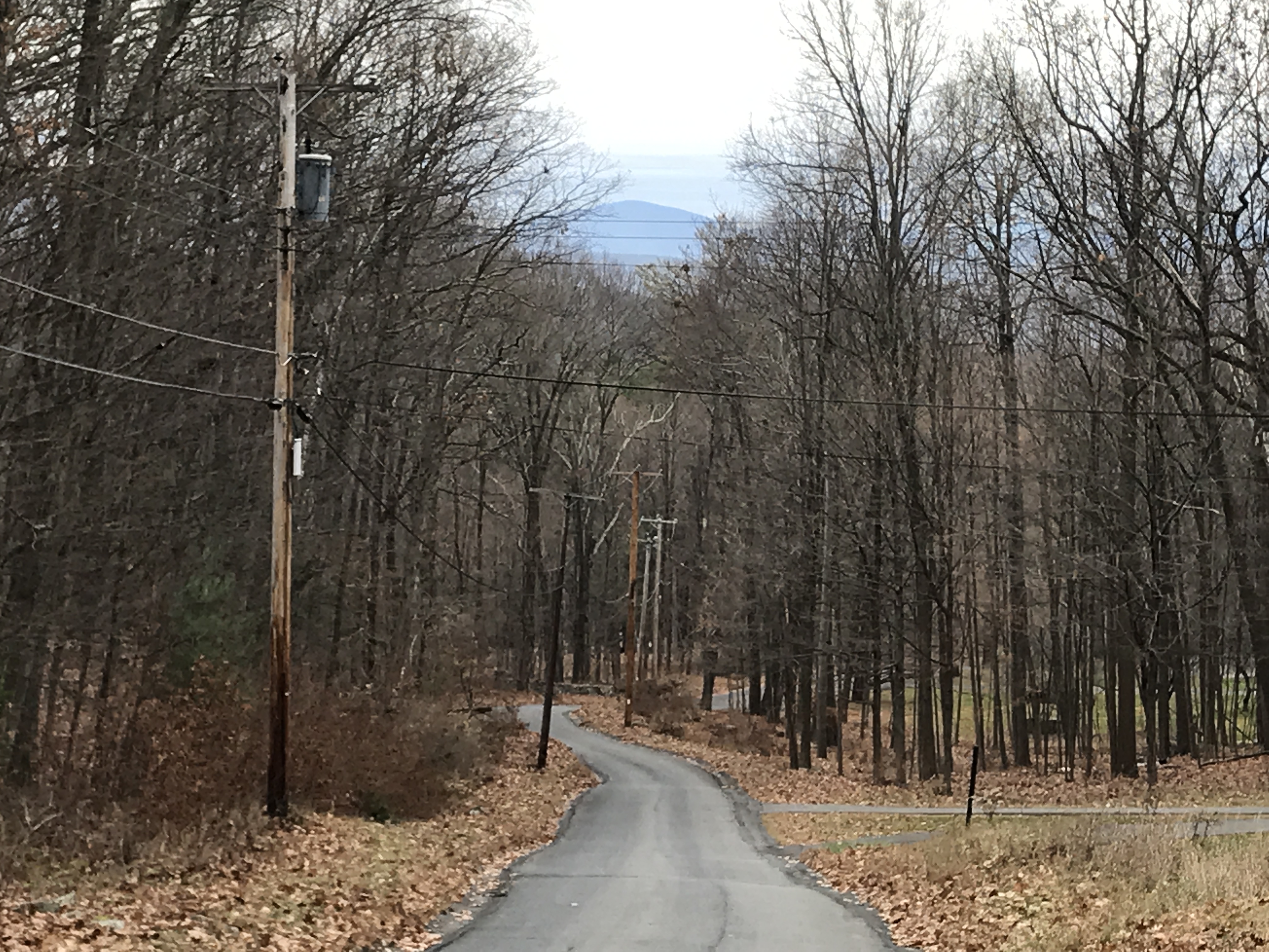Soon I was removing my gloves and loosening my scarf. The road is steep. It didn’t take long to be able to turn around and see the Catskills beyond the tree line, a dreamy blue in the distance. I passed stone walls from an old estate, an entrance to nowhere, covered in vines and brush. Before the road turns to gravel, there is a beautiful old house that hasn’t been lived in for many years, and I always expect to see a ghost walking past one of its warped glass windows. Once on the last and steepest stretch, I passed a man walking down, and we waved to each other. I made it to the top in about forty-five minutes. So close!