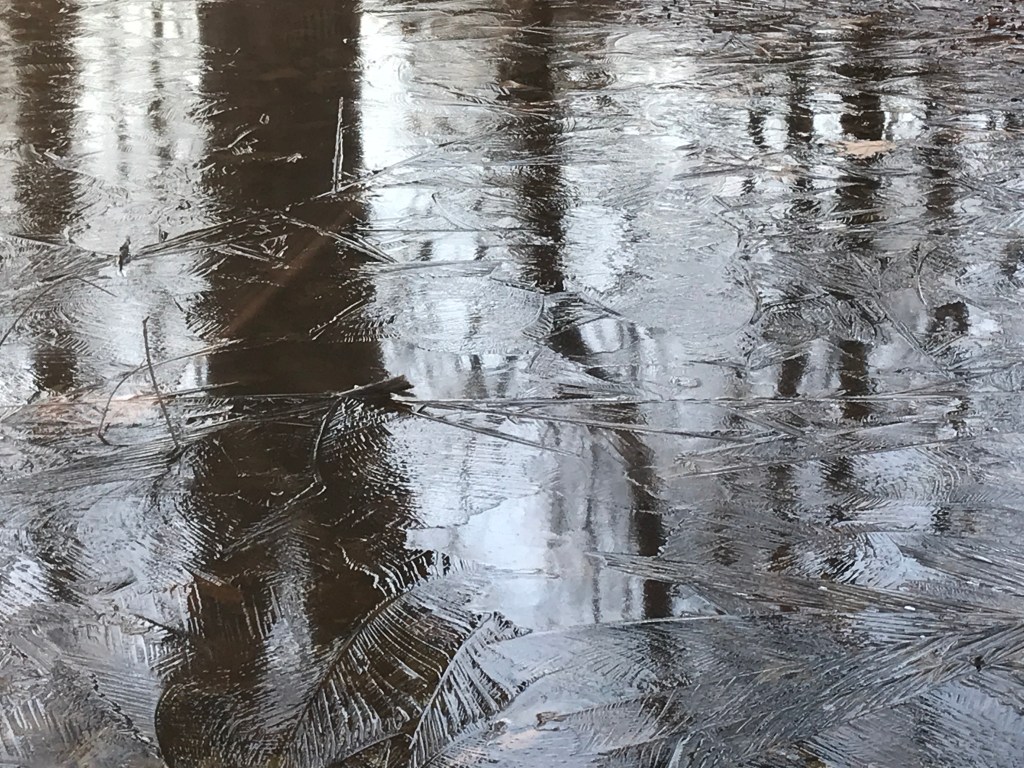 The other day I went to inspect a few vernal pools I like to skate on in the winter. All summer the pools were dry and dusty. I was worried this year there wouldn’t be enough water to make a decent sized rink, but a recent epic rainfall fixed that. A favorite pool is now filled to its regular amount, and since then the many white oak leaves resting on the surface have settled to the bottom leaving a glassy reflection of the trees that bend around it. Cold temperatures have come and left the water punctured in fractals. The first ice is mesmerizing–the patterns are like feathers, graceful and arcing yet still managing to be geometric.