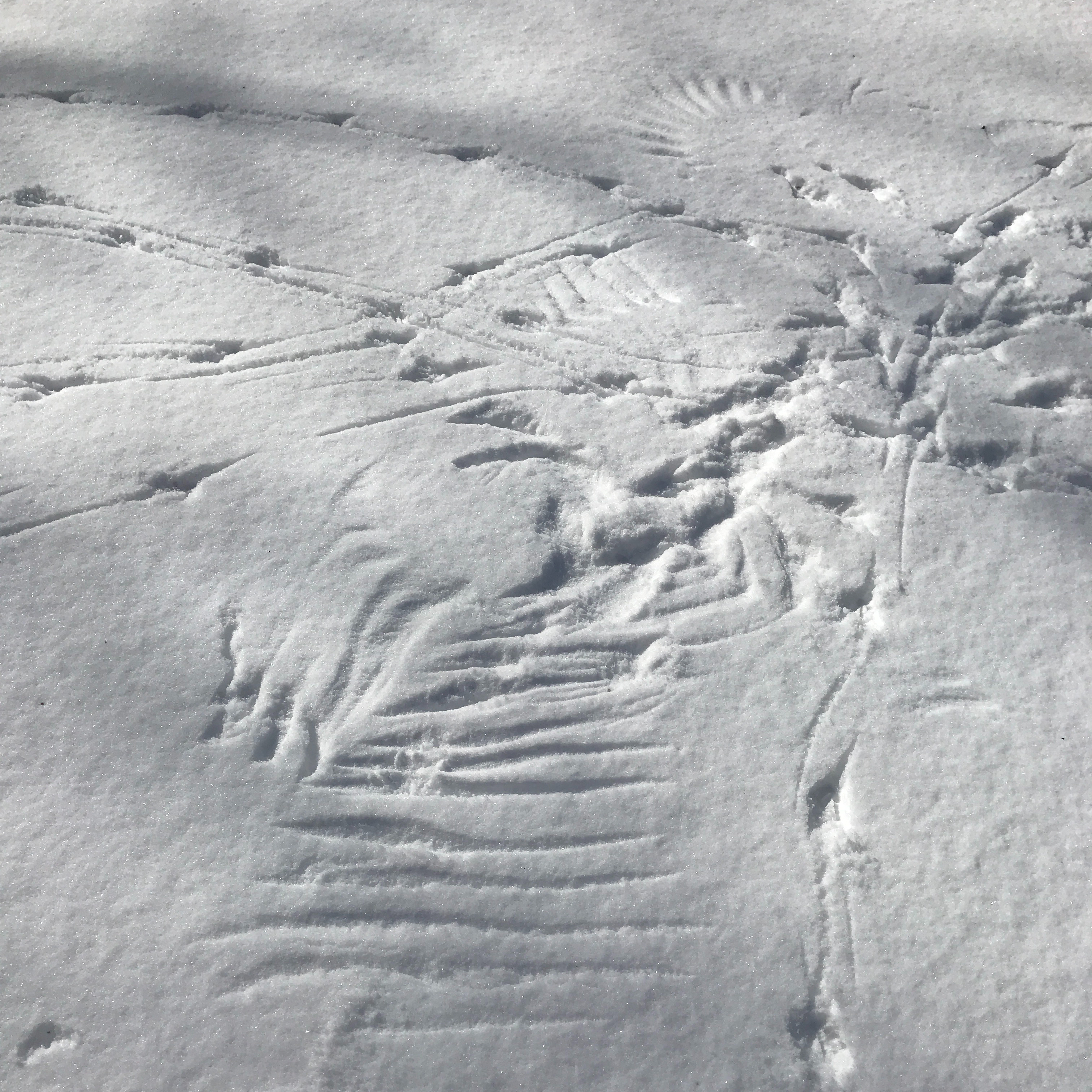 These days, I listen to the flocks on the hill from my house: the sounds are varied and sometimes surprising. I’ll think: was that really a crow? They are very wary, and if I come too close they’ll fly away en masse moving just enough to have a certain distance from me. After it snowed most recently, the hill had millions of little crow foot prints stitched on the surface. They were like hieroglyphics that showed their dancing moves– curious, impetuous steps. There were wing prints too, as they hop around they flap their wings leaving those long fingertip marks in the snow. It was like a short story written in crow’s feet.