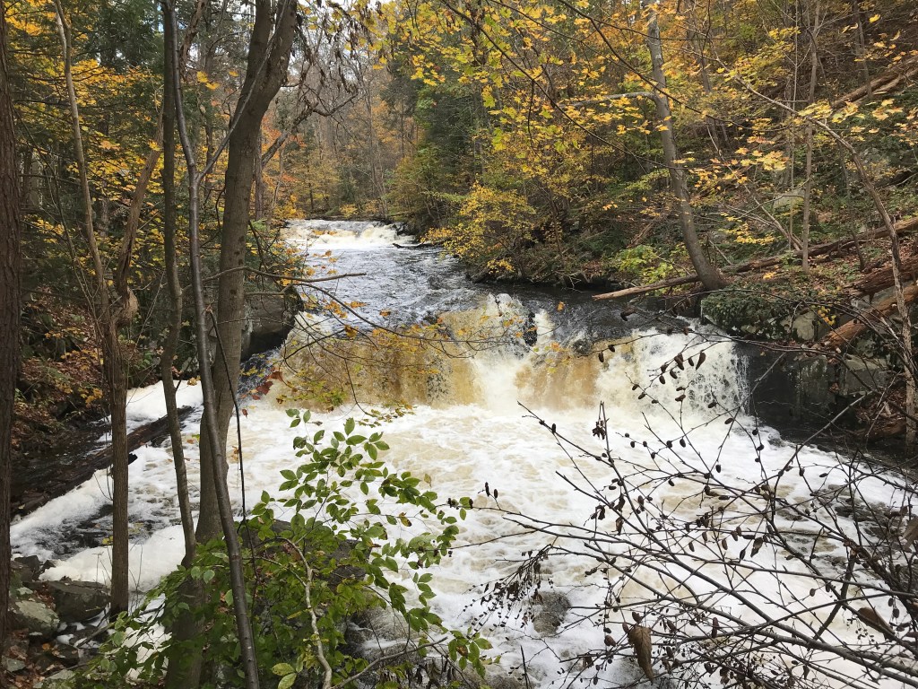 Last night it smelled properly like October, and I took deep lungfuls of the cold smoky air that was slightly painful but delicious. This morning the grass looked almost like frost–but we still haven’t had a hard frost yet. And it’s still incredibly wet. It’s the wettest fall I’ve ever seen. I’m not saying I remember everything, but it definitely seems different. I had a nice silent walk to visit some waterfalls I know. No one else was on the trail, and I was able to soak in the falling leaves, the thick luxurious moss and the rushing stream. The water levels are unlike anything I’ve ever seen. The stream is unrecognizable. When I see it I breathe in sharply and whisper, “Wow!” You can’t help but to react this way if you know the stream. It looks more like a river now, much wider, much stronger, rippling muscularly in its middle. The gentle falls are now white rapids, and you can see in the thickest parts that the water is tinged tan from all the leafy tannins. This is big water even by spring deluge standards. I just can’t believe it, and I mutter to myself that it’s all very different now and that things aren’t changing. They have changed.