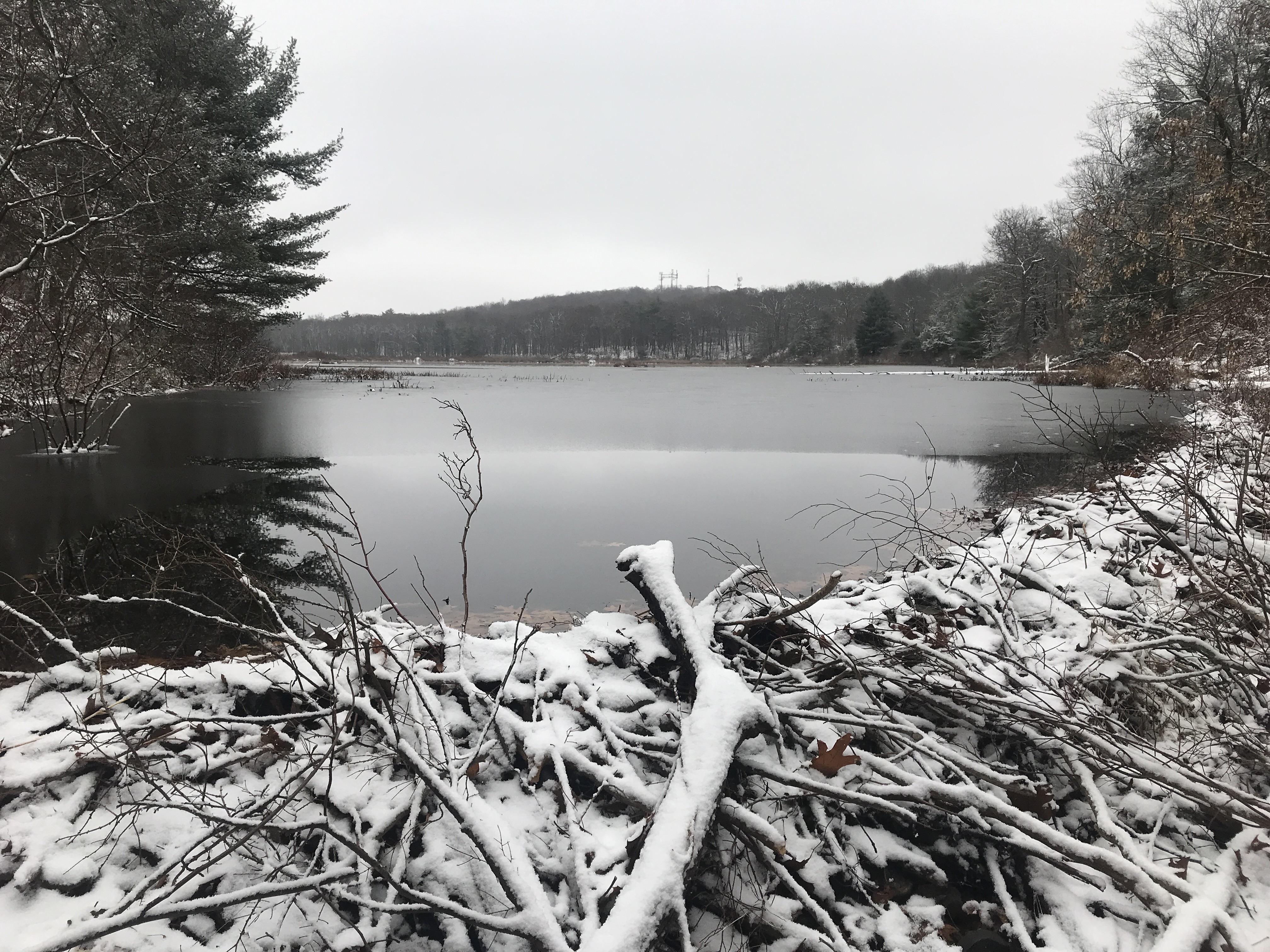 First snow! I woke up this morning to a patchy white world, but now it’s just dotted with white. I made sure to go up on the ridge as soon as I could, where the snow is a bit thicker. Maybe an inch? It was exhilarating to see it again—the chestnut oaks deep and grooved bark flocked with white, the Christmas ferns completely white except a deep green outlining their jagged edges, stones covered with a white frosting. The sky is low and gray, but the snow has stopped. The pond up on the ridge was a steely gray matching the sky. The birds don’t seem to mind and flutter here and there. I looked for paw prints in the already disappearing snow. I think the best part of snow is seeing how busy our wild neighbors are. Every log had a flurry of squirrel prints, yet the woods remained still, seemingly empty.