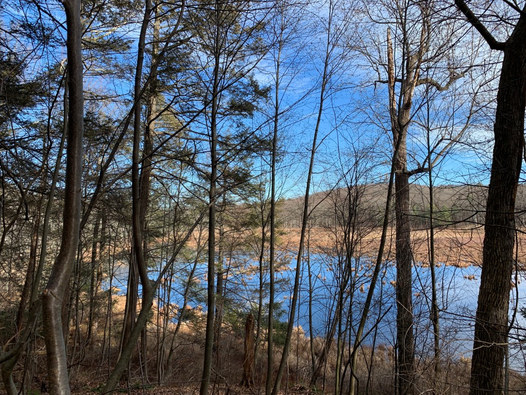 Off in the distance, I can see the pond through the trees, and the water is a brilliant blue reflecting the color of the sky. I am taken by the view, framed by hemlock branches filled with cones and birch branches with catkins, coming closer until I notice that the water is quite still, the surface seems frozen, and I am amazed by how different the view is here, in this particular spot. I had gone off trail, and I realized I had never before in all my walks seen it from this precise location, time, season. I had a moment of pure nowness, that, I realize, is why I walk.
