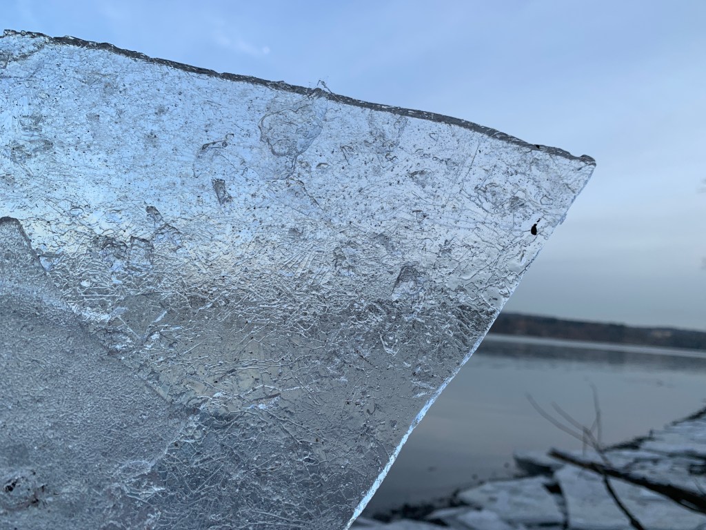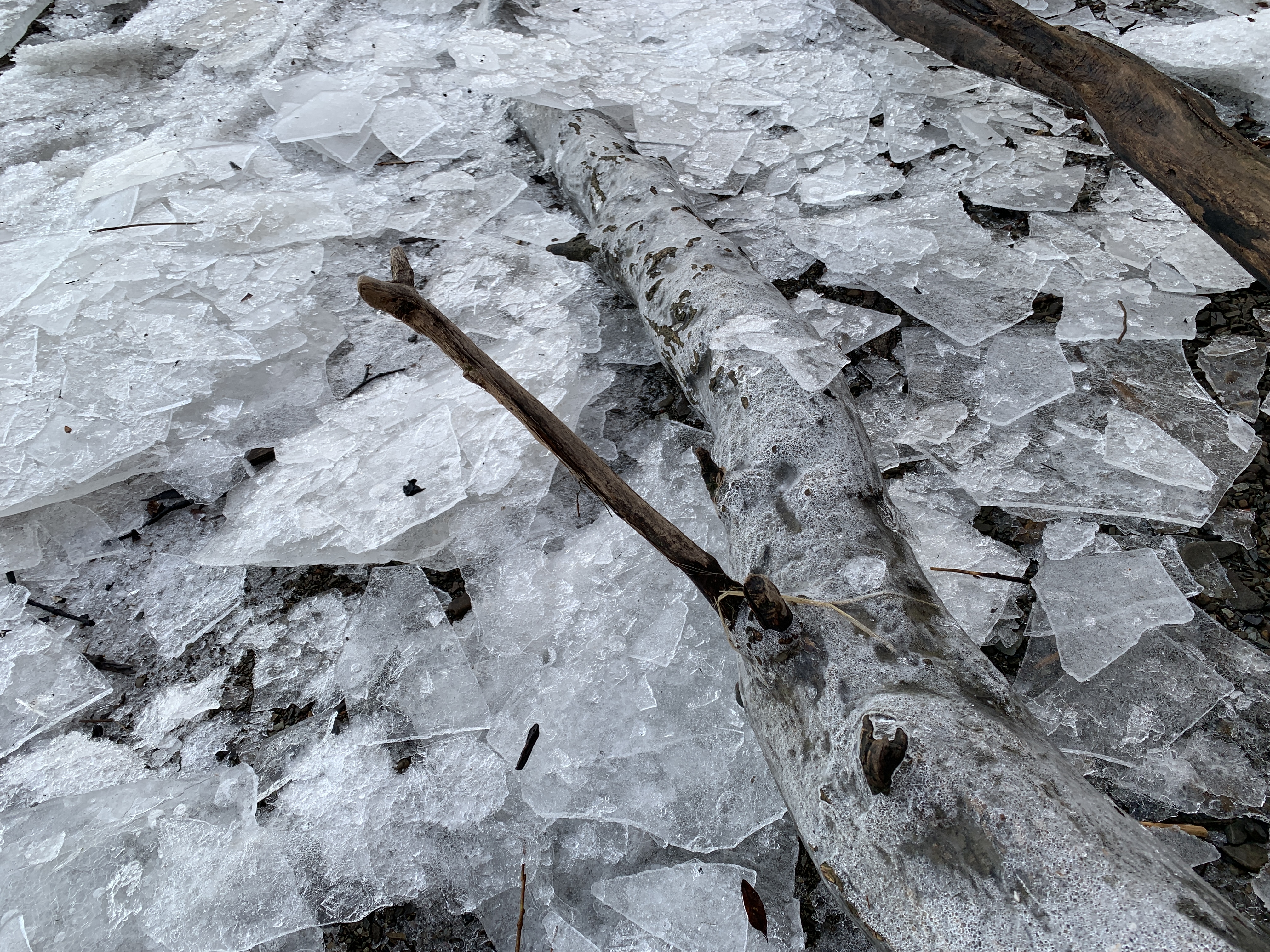 The river is at low tide, leaving several different types of ice on the shore. There are piles of chopped ice that undulate in waves where the tide left it at its highest point. You can move this ice–shiny piles of tiny shards that scatter like sand when you push a toe in it. In the middle of the sandy shore, there is the same kind of ice, but it is frozen solid into a mountain ridge-like line, black and gray with sediment. Then there are big huge plates of thin clear ice. These are perfect for stomping on; the satisfaction of shattering ice is a deep sensory pleasure.