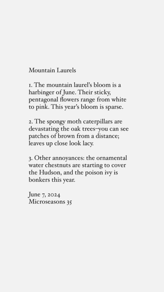 This week, I went to check on the mountain laurels, and indeed they were blooming! It’s a yearly pilgrimage, yet this year they were sadly underwhelming. Some years they are a wonder, an explosion, but this year they are only dotted at the tops of the bushes, every so often there is an abundant plant. That’s okay, I tell them, you can’t be on every year. The kousa dogwoods are also sparse this year, yet last year they were glowing, lasting weeks. Every year is slightly different, even though it seems like it’s the same old thing.